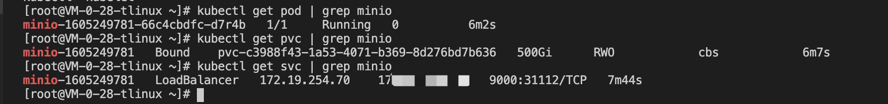 In the cluster, use the helm tool to create a minio test service with a persistent volume, and the minio installation method can be found in the minio installation, in which case can bound a load balancer for the minio service to access the management page using a public address in the browser.