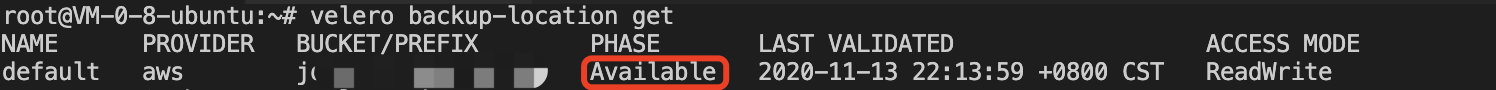 Executing the ‘velero backup-location get’ command to view the storage location status and display “Available” indicates that access to Tencent Cloud COS is OK, as shown in the following image: