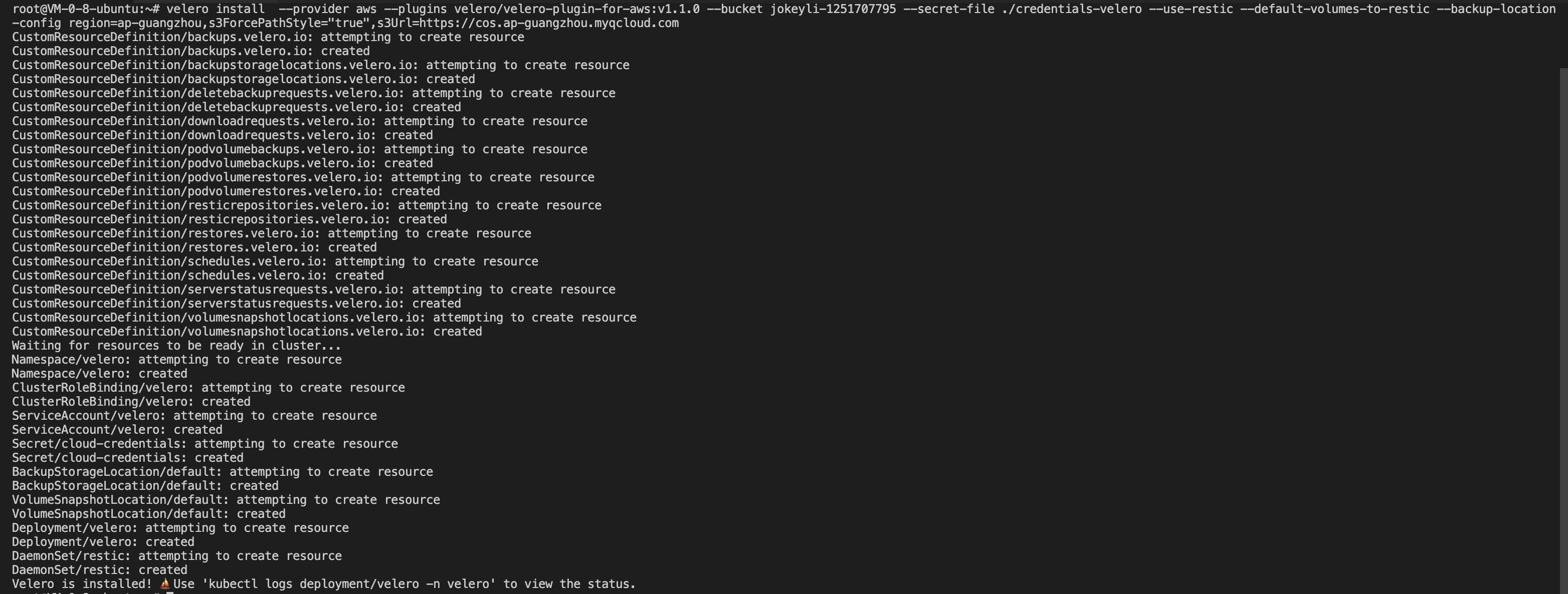 At this point, The installation using Tencent Cloud COS as Velero storage location is complete, If you need more installation information about Velero, You can see the official website Velero documentation .