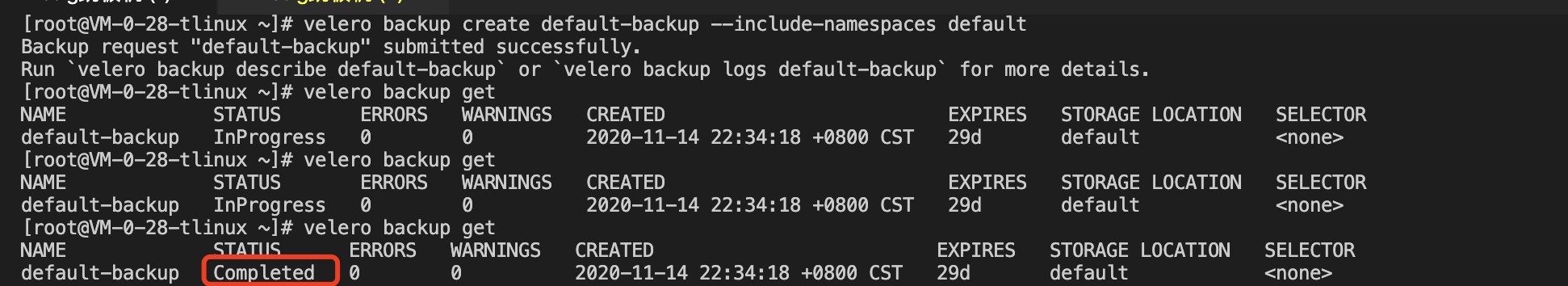 Use the velero backup get command to see if the backup task is complete, and when the backup task status is “Completed,” the backup task is completed without any errors, as shown in the following below: