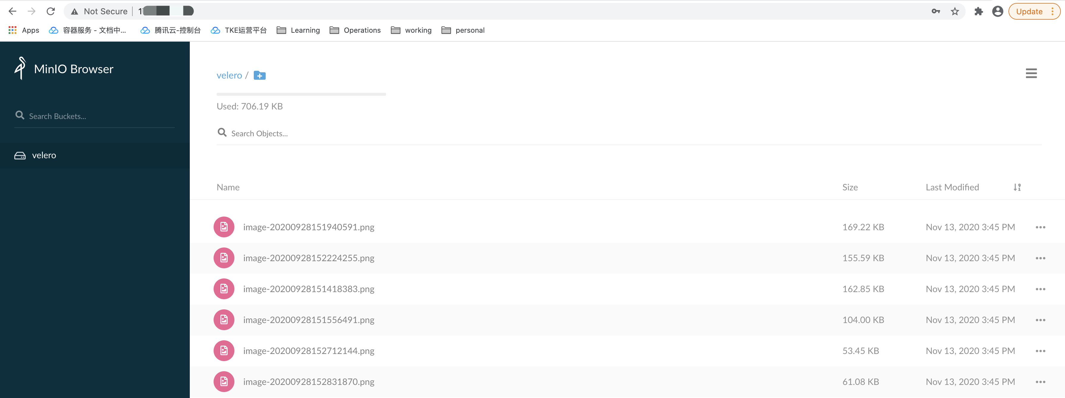 Log in to minio’s management page on your browser and you can see that the previously uploaded picture data is still there, indicating that the persistent volume’s data was successfully restored, as shown below: