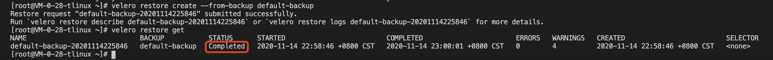 Use the velero backup get command to see if the backup task is complete, and when the backup task status is “Completed,” the backup task is completed without any errors, as shown in the following below: