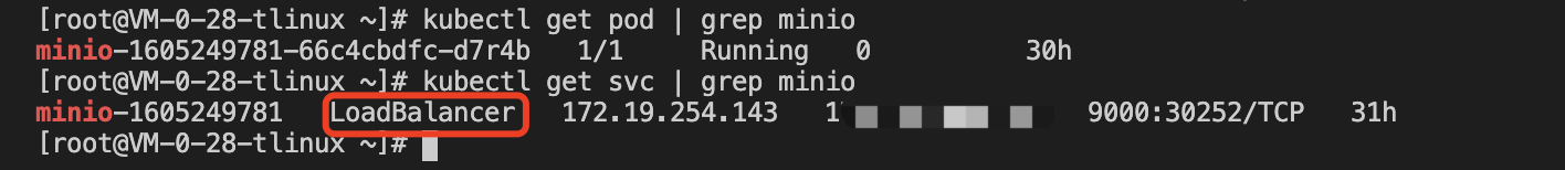 In the cluster, use the helm tool to create a minio test service with a persistent volume, and the minio installation method can be found in the minio installation, in which case can bound a load balancer for the minio service to access the management page using a public address in the browser.